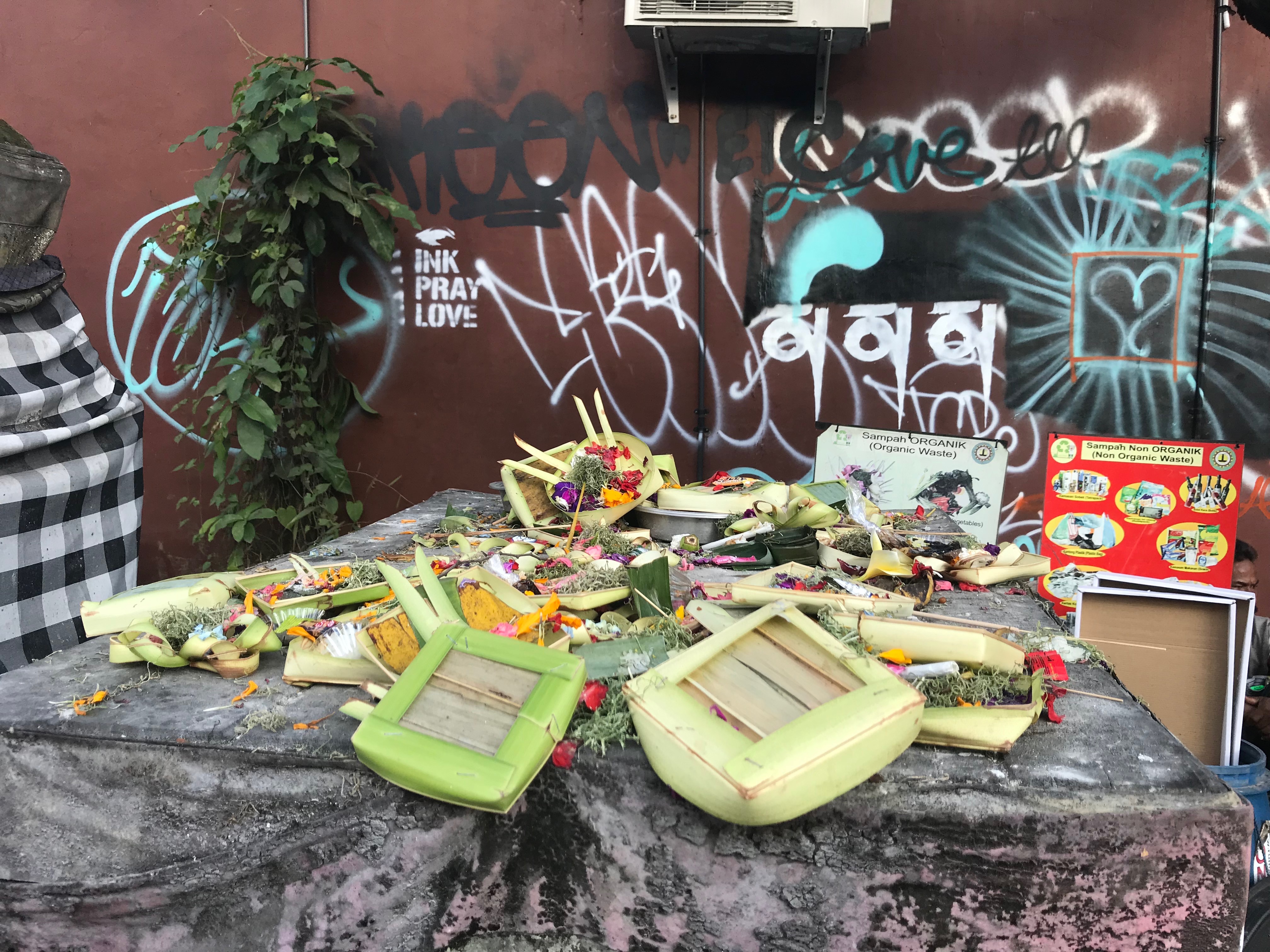 Überall in der Stadt, auf Gehwegen, vor Läden etc. liegen Canang Sari verteilt, das sind kleine Körbchen aus Palmenblättern mit Blumen, Reis und Keksen. Es duftet dazu nach brennenden Räucherstäbchen und nach Jepun, gelb-weisse Frangipaniblüten, die im Konfettistil gestreut werden. Das sind Opfergaben für die Götter, die gleichzeitig die bösen Geister abhalten sollen. Bali ist eine hinduistische Enklave mitten in Indonesien. Die Balinesen richten sich nach ihrer Religion und Kultur. Fast jeden Tag wird etwas gefeiert. An Gemeinschaftsorten machen Männer Musik auf Bronzegongs, Metallophonen, und Bambusflöten, sie bilden ein sogenanntes Gamelanorchester, das hier jedes Kind zu spielen lernt. Jeden Abend gibt es in den Tempeln traditionelle balinesische Tänze. Oder sie bereiten eine Feuerbestattung vor, die auch im berühmten Monkey Forest, ein Naturpark mit hunderten frechen Affen und mystisch wirkenden Tempelanlagen, stattfindet.